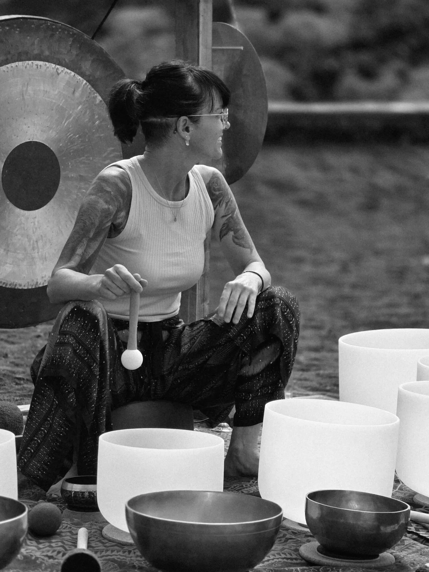 Afterwards, we deepen the experience and enter a state of absolute relaxation during a sound bath. Tibetan singing bowls, the great gong, and other therapeutic instruments allow healing frequencies to be felt – reaching every cell of your body.