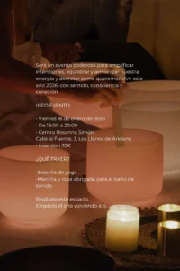 El 16 de enero de 2026 te invitamos con mucho gusto a una sesión especial de yoga y sound healing para comenzar el nuevo año con calma y consciencia, establecer intenciones y volver a habitar el cuerpo con presencia y serenidad.